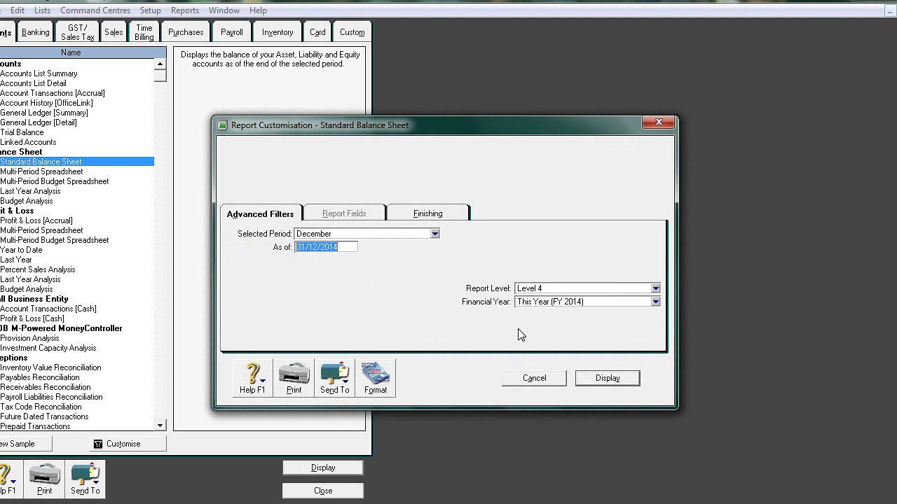 -To modify the balance sheet report, you select the date range (the same as the profit and loss report), click 'Customize Report' (or 'Modify Report' in older versions), and then add sub-columns for the previous period and dollar change.